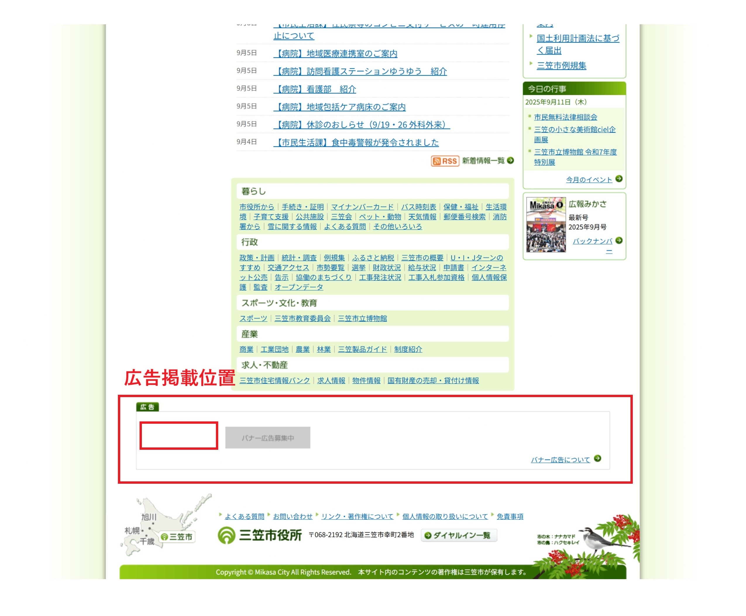 三笠市ホームページのTOPページに貴社のバナー広告が出せます。