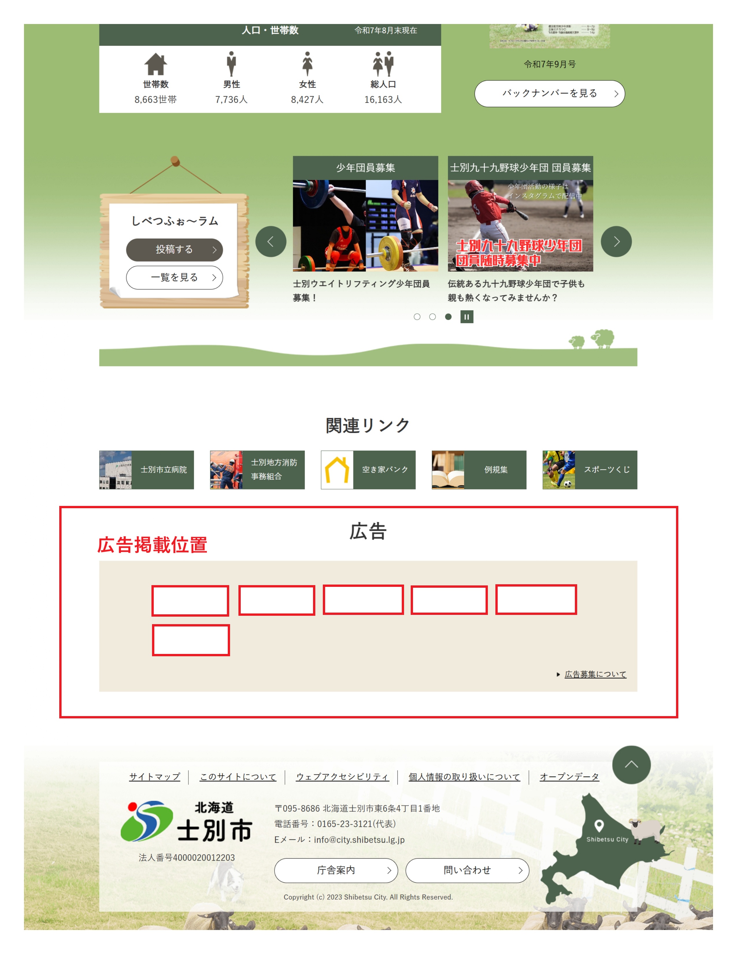 士別市ホームページのくらし・行政サイトページに貴社のバナー広告が出せます。