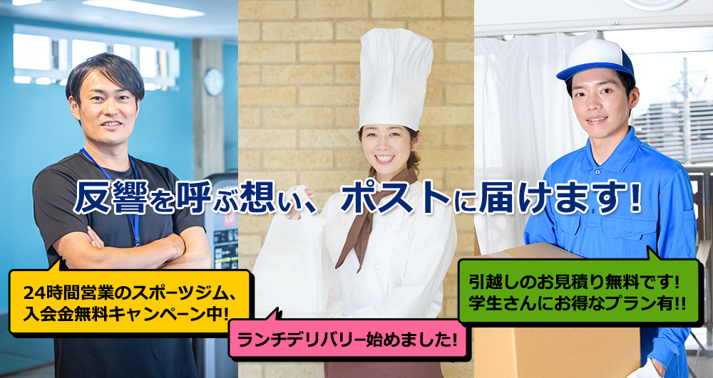 ポスティングは、さまざまな販促物(チラシ・試供品など)をダイレクトにご家庭に配布できる非常に有効な手段です。昨今の新聞購読率の低下に伴い、新聞折込ではアプローチできない商圏内のお客様に対して有効なプロモーションとして成果を上げ、様々な企業から注目を集めています。