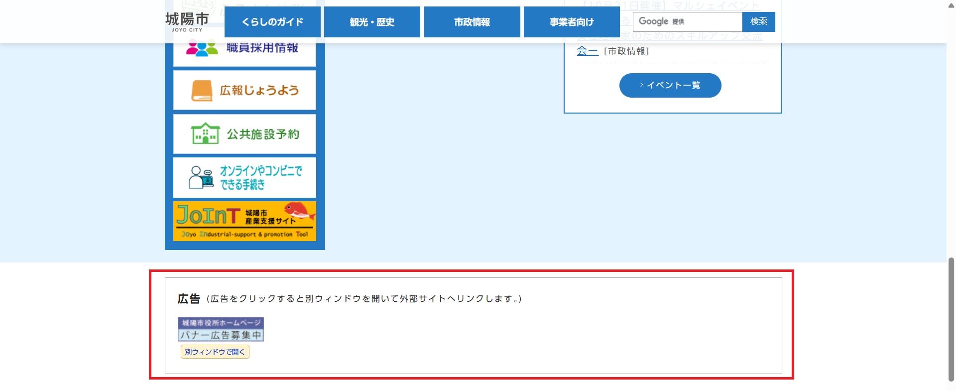 城陽市ホームページのTOPページに貴社のバナー広告が出せます。