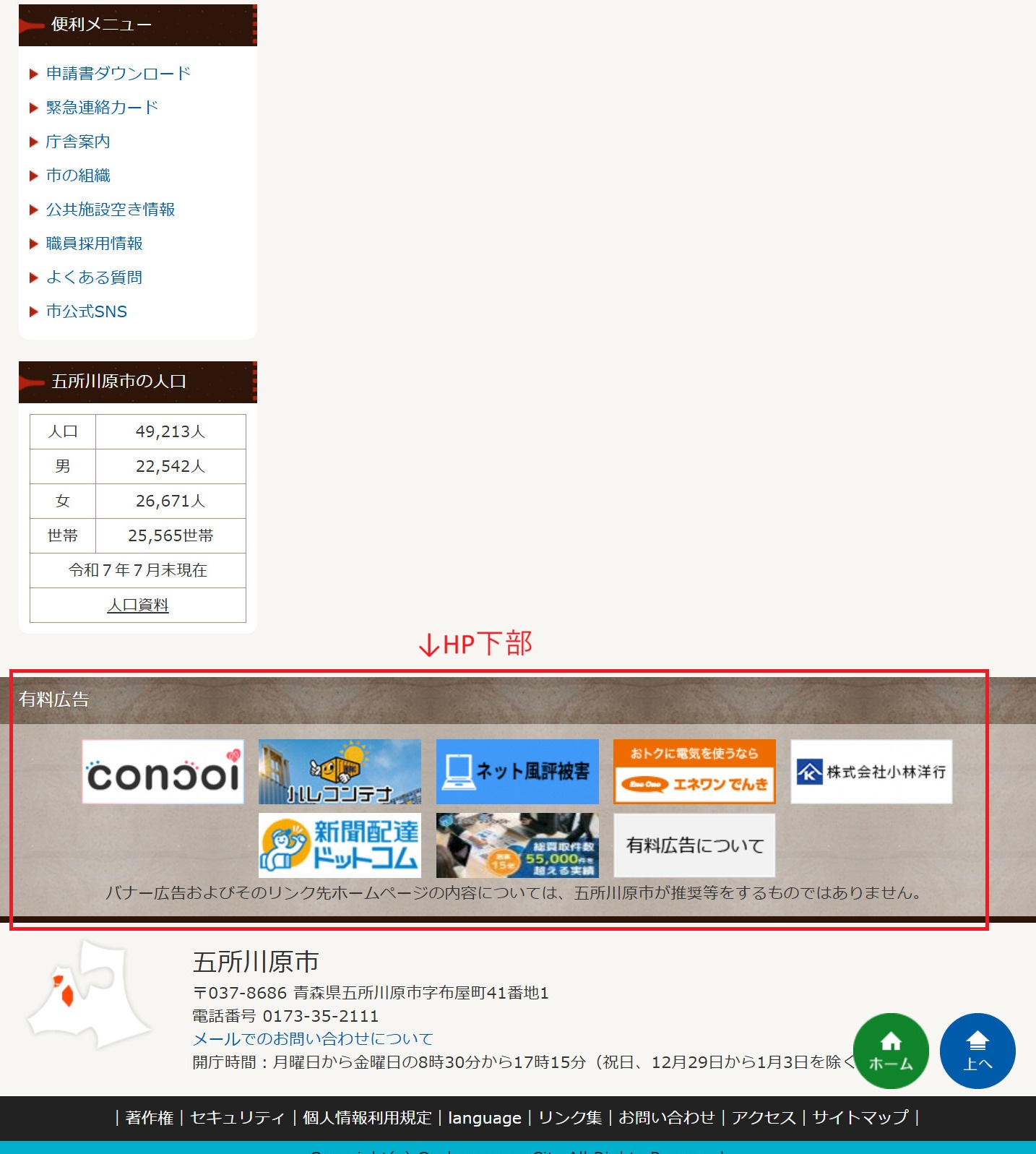 五所川原市ホームページのTOPページに貴社のバナー広告が出せます。
