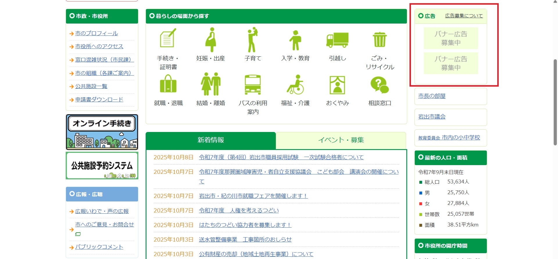 岩出市ホームページのTOPページに貴社のバナー広告が出せます。