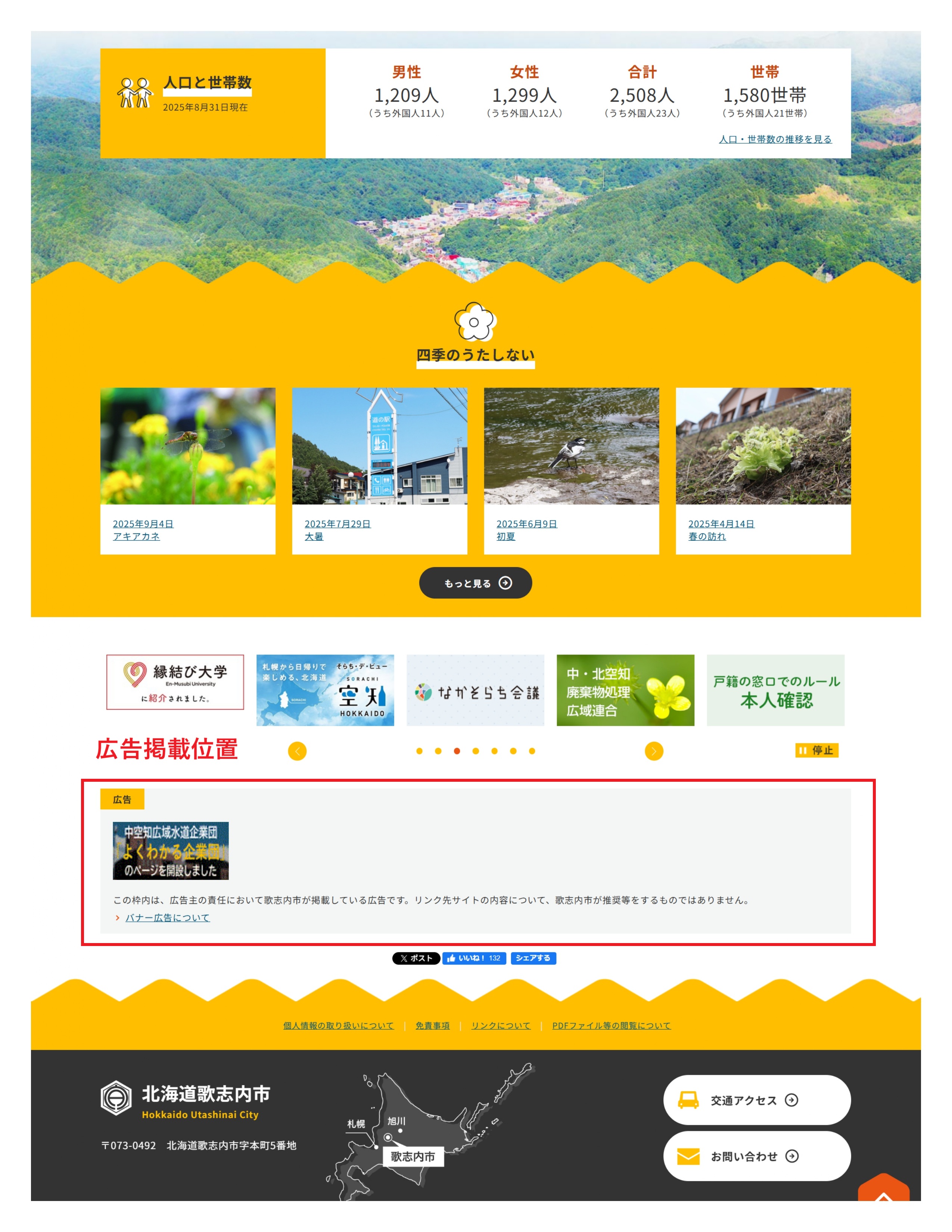 歌志内市ホームページのTOPページに貴社のバナー広告が出せます。