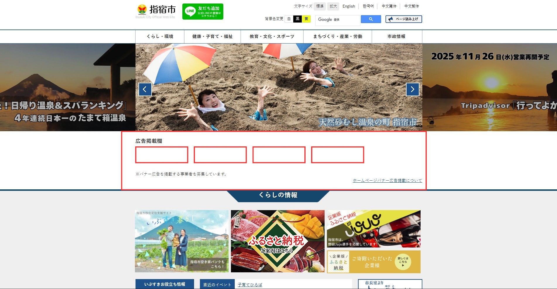 指宿市ホームページのTOPページに貴社のバナー広告が出せます。