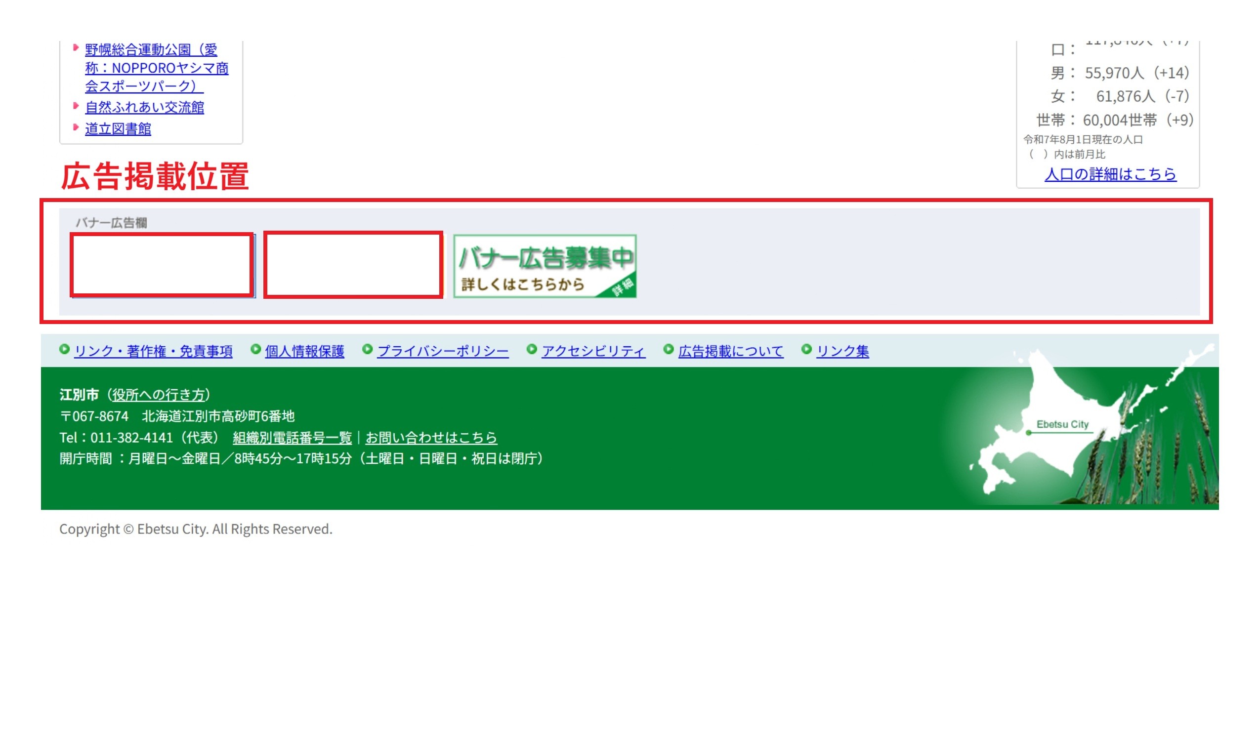 江別市ホームページのTOPページに貴社のバナー広告が出せます。