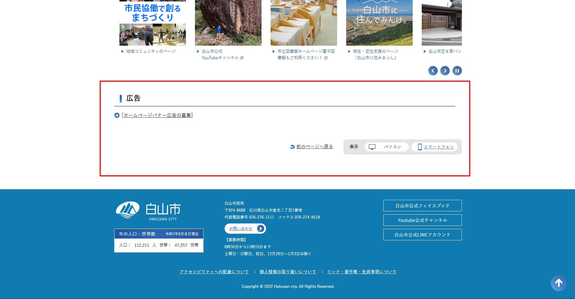 白山市ホームページのTOPページに貴社のバナー広告が出せます。